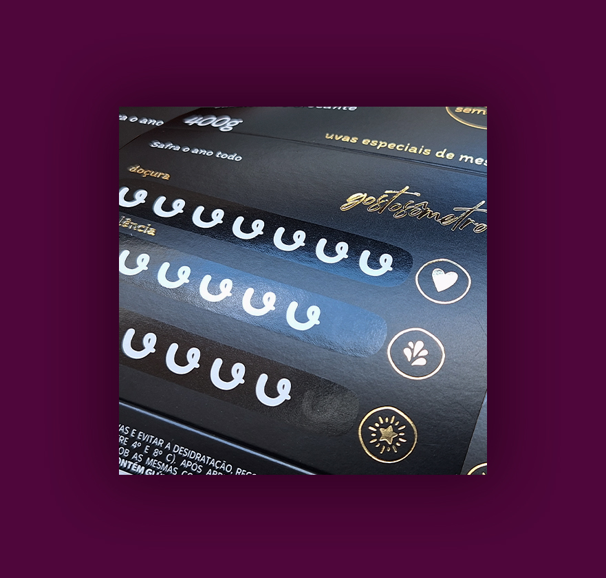 Era essencial que a embalagem expressasse a indulgência das uvas e reforçasse sua posição como produto de alto padrão. Para isso usamos uma estética minimalista, explorando tons profundos equilibrados por elementos visuais leves e convidativos e acabamentos especiais com hot stamping e verniz de reserva.