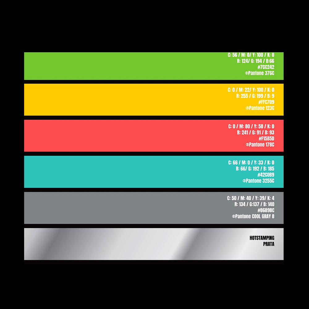 Paleta de cores: organizada por categorias, com tons vibrantes que comunicam energia e vitalidade. O verde institucional conecta a saúde e natureza, enquanto o hot stamping prata agrega sofisticação e performance.