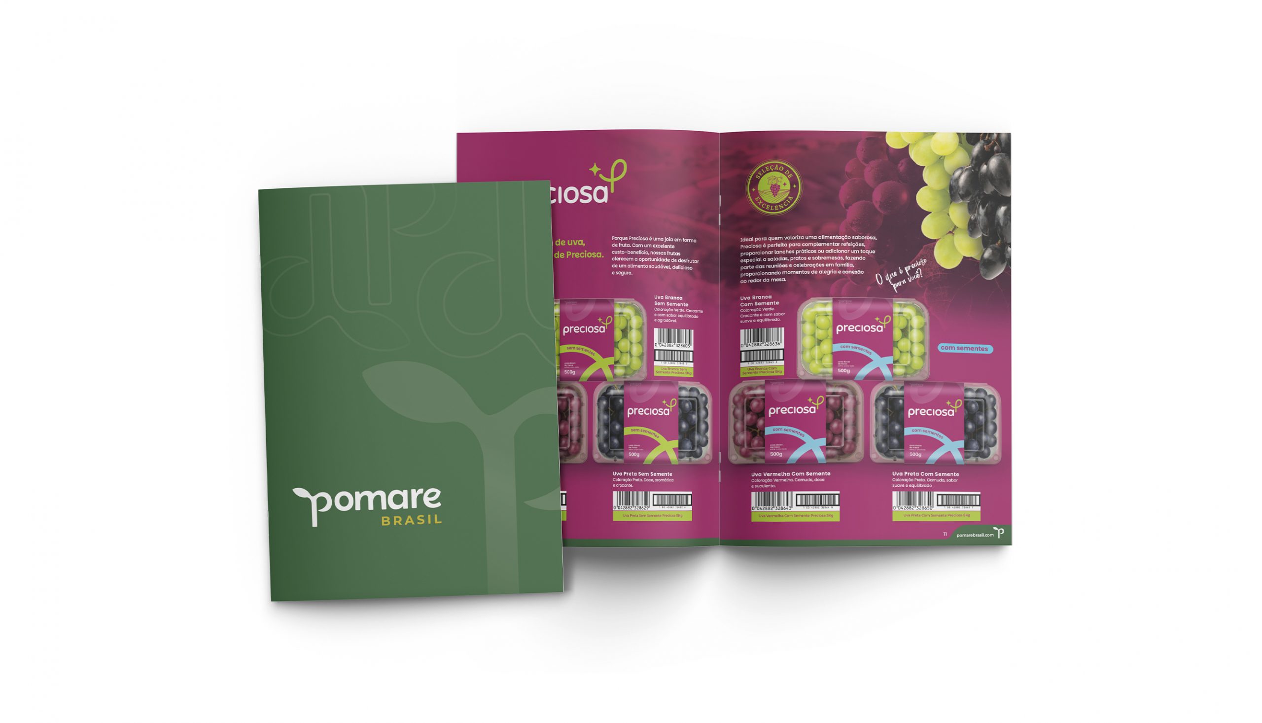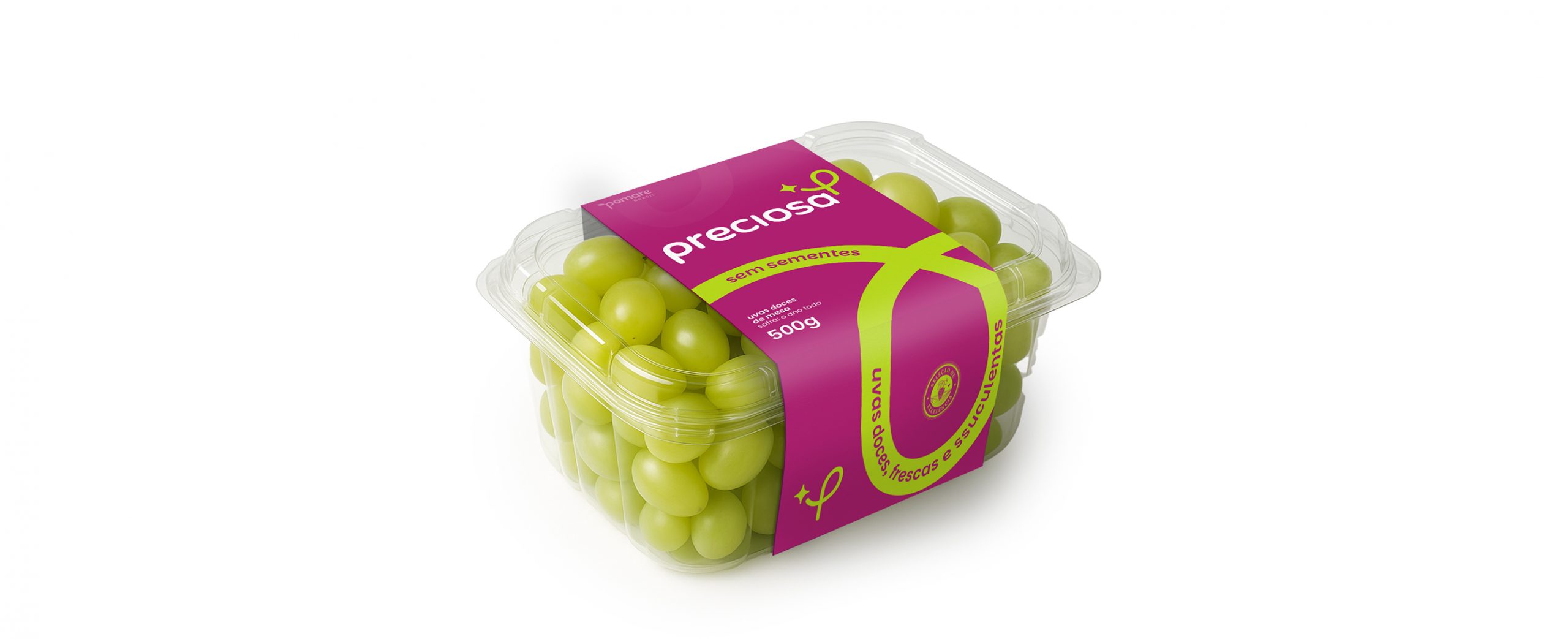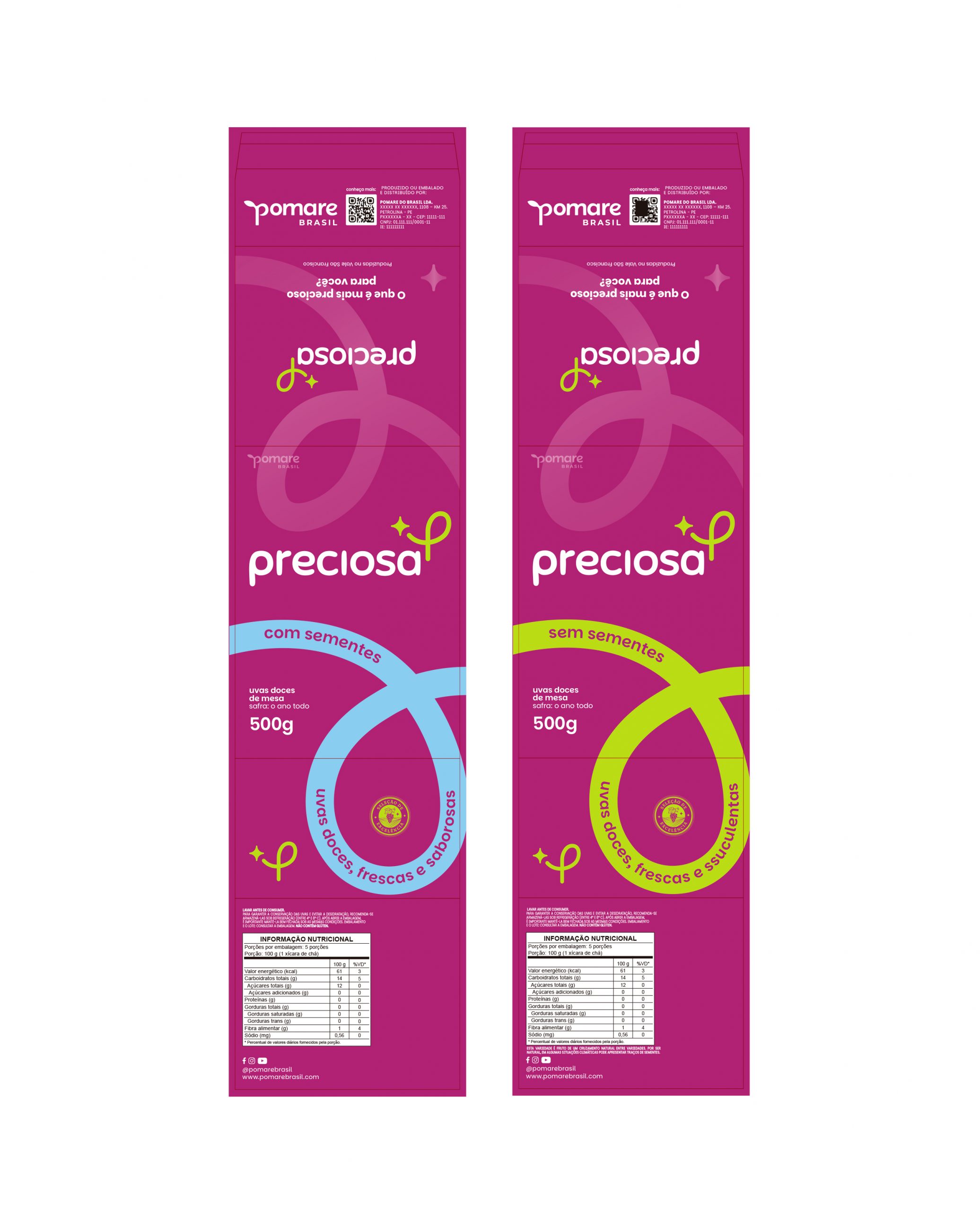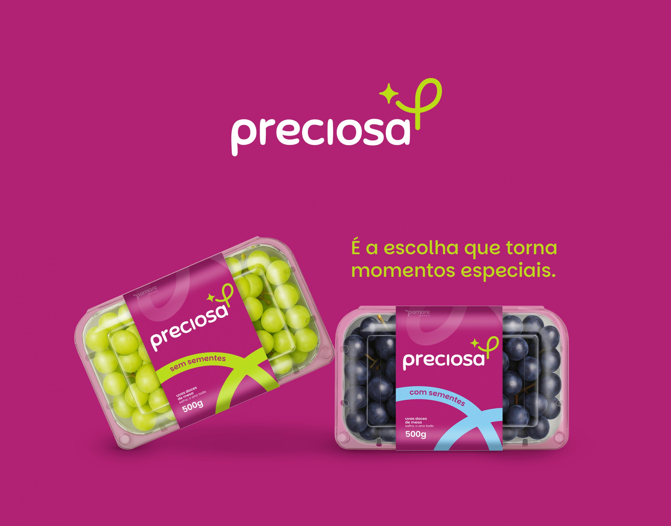 A Preciosa, integrante do grupo Pomare, foi criada para oferecer uvas de alta qualidade em uma proposta mais acessível. O desafio foi desenvolver uma identidade visual que transmitisse qualidade e sabor, ao mesmo tempo em que se diferenciasse da linha premium Luvvi, garantindo autenticidade e conexão com seu público.